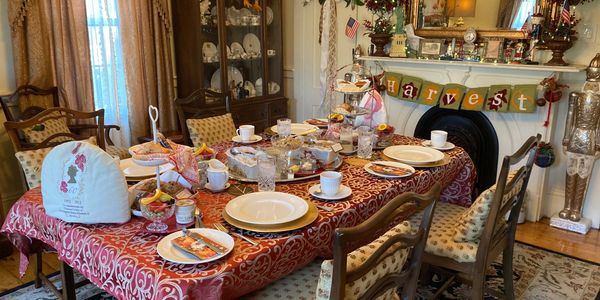 Across the hall from the parlor is the breakfast room, furnished with an antique dining suite